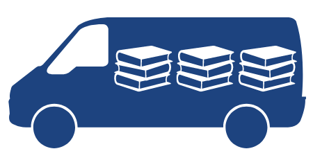 A blue van with graphic images of stacks of white books inside