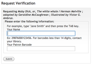 Next you will be asked to enter your name and your library card number (the 14 digit barcode number on your library card.) Once you enter this information, click the Submit button, and you should see a message telling you that your request was successful.