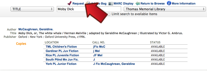 Once you have found an item you’d like to borrow, you can request the item using your library card. Available Items requested from other Minerva libraries that have a status of “AVAILABLE” usually are delivered to Thomas Memorial Library within a few days. For more information on requesting materials, click here.