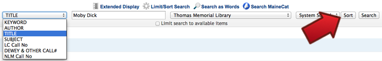 A search by title, author, or subject will automatically bring up titles sorted alphabetically by title. A search by keyword will automatically bring up titles sorted by publication date, with the most recent publication date first. If you wish to change the sort order of search results, simply drop down the menu next to the sort button, make your selection, and click the sort button: